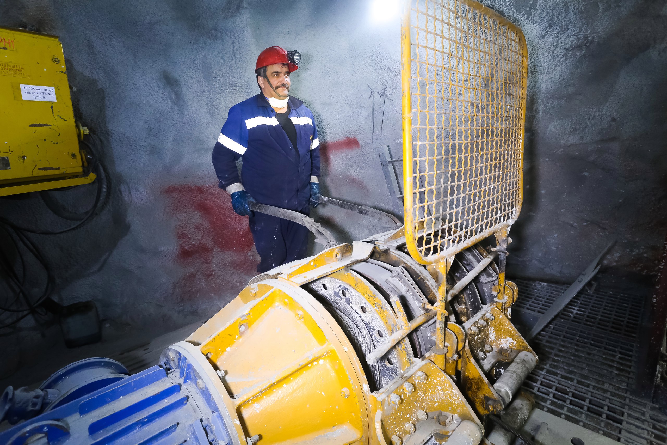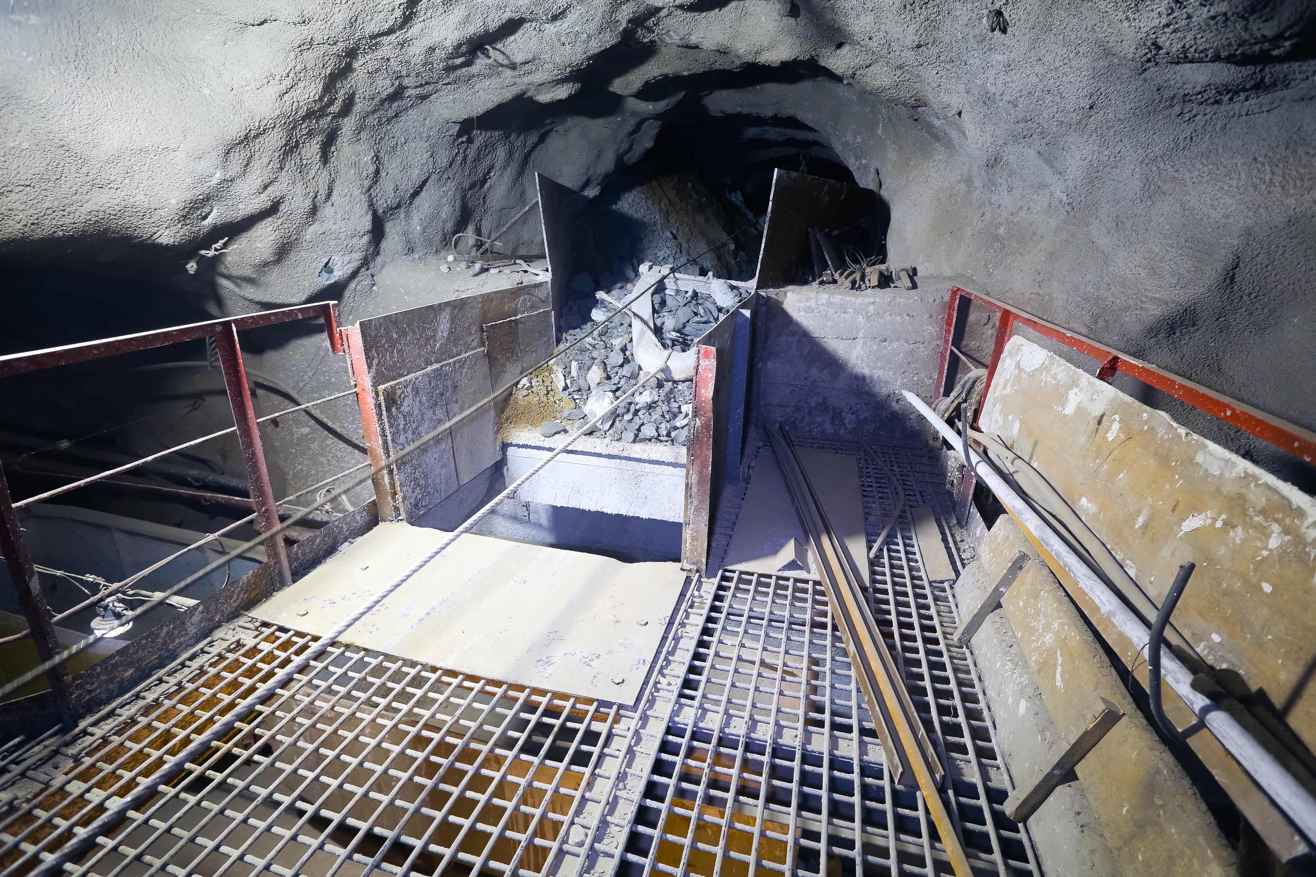 Горную массу после проходческих работ с километровой глубины на-гора вывозят вагонетки, где на поверхности в здании копра шахты «Новая» установлены две тележки-платформы, два толкателя, круговой опрокидыватель, пластинчатый питатель и ленточный конвейер – весь этот комплекс создан для перегруза горной массы на поверхности. Вагонетка подается на платформе в круговой опрокидыватель. Платформа, на которой прочно закреплена вагонетка, переворачивается, порода пересыпается в бункер и с помощью ленточного конвейера загружается в БелАЗы. А пустая вагонетка снова возвращается на горизонт за новой партией породы. На весь цикл от погрузки до возвращения вагонетки на горизонт уходит порядка 35-40 минут. Восьми вагонеток достаточно, чтобы обеспечить непрерывность процесса выдачи горной массы на поверхность.
