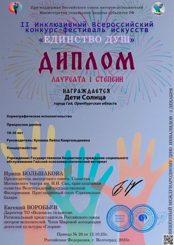 «Дети солнца» из Гая стали лауреатами I степени на Всероссийском конкурсе-фестивале искусств «Единство душ». Мероприятие прошло в октябре 2025 года в Волгограде. Девушки исполнили танец «Прекрасное далёко». Их искренность, слаженность и мастерство впечатлили жюри. Артистки получили Диплом лауреата I степени.