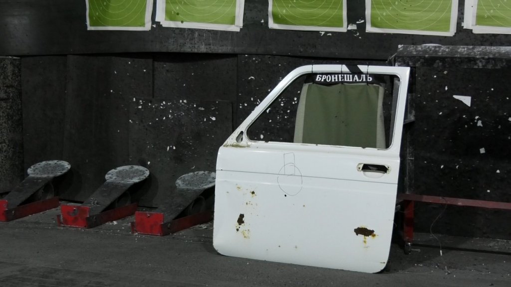Для сравнения, сейчас попытаемся попасть в дверь «Нивы», чтобы посмотреть, как держит пулю металл и сравнить с тем, как держит бронешаль.