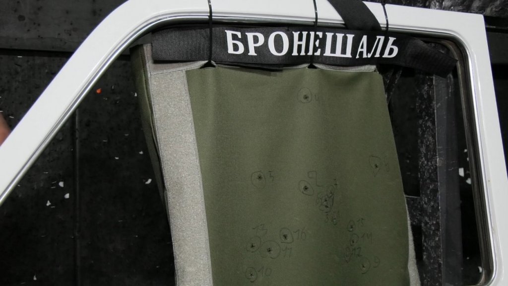 И вот оно — легкое, съемное и надежное. Весит бронешаль всего килограмм, она состоит из тонких композитных слоев толщиной три миллиметра, в которых вязнет пуля, что доказано длительными испытаниями — сначала в тире.