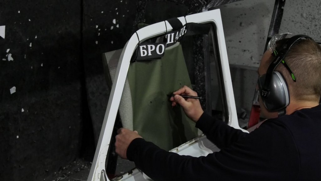 Пуля из пистолета Ярыгина — это самый мощный короткоствол, который у нас сейчас используется, в том числе и спецподразделения его используют. У него поражающая способность на 50 метров. Та же пуля из карабина «Сайга» имеет поражающую способность уже 100 метров. Кинетическая энергия на порядок мощнее, пробивная способность на порядок мощнее. Поэтому нам сегодня нужно испытать натурный образец на износ, то есть насколько он выдерживает многократное попадание. По нормативам, любая броня считается одноразовой в этих классах, в которых мы работаем, — Бр1, Бр2, до Бр3 мы не дошли пока — допускается в определенных условиях, что выдерживает три попадания на некотором расстоянии друг от друга. Мы сегодня будем стрелять 20 или больше попаданий, посмотрим, насколько удастся пробить.