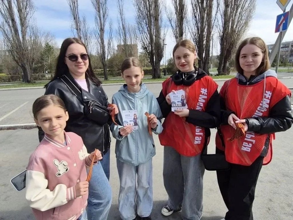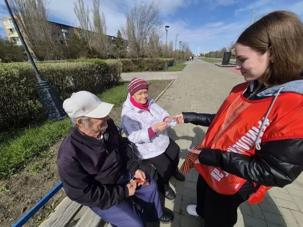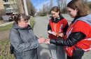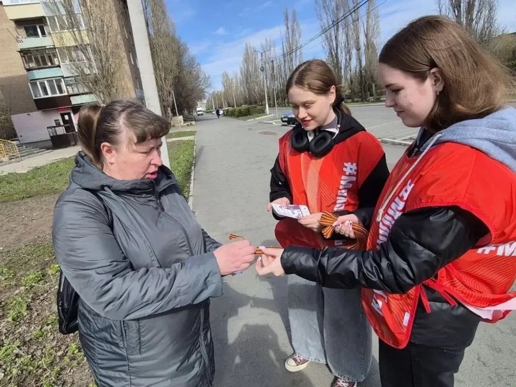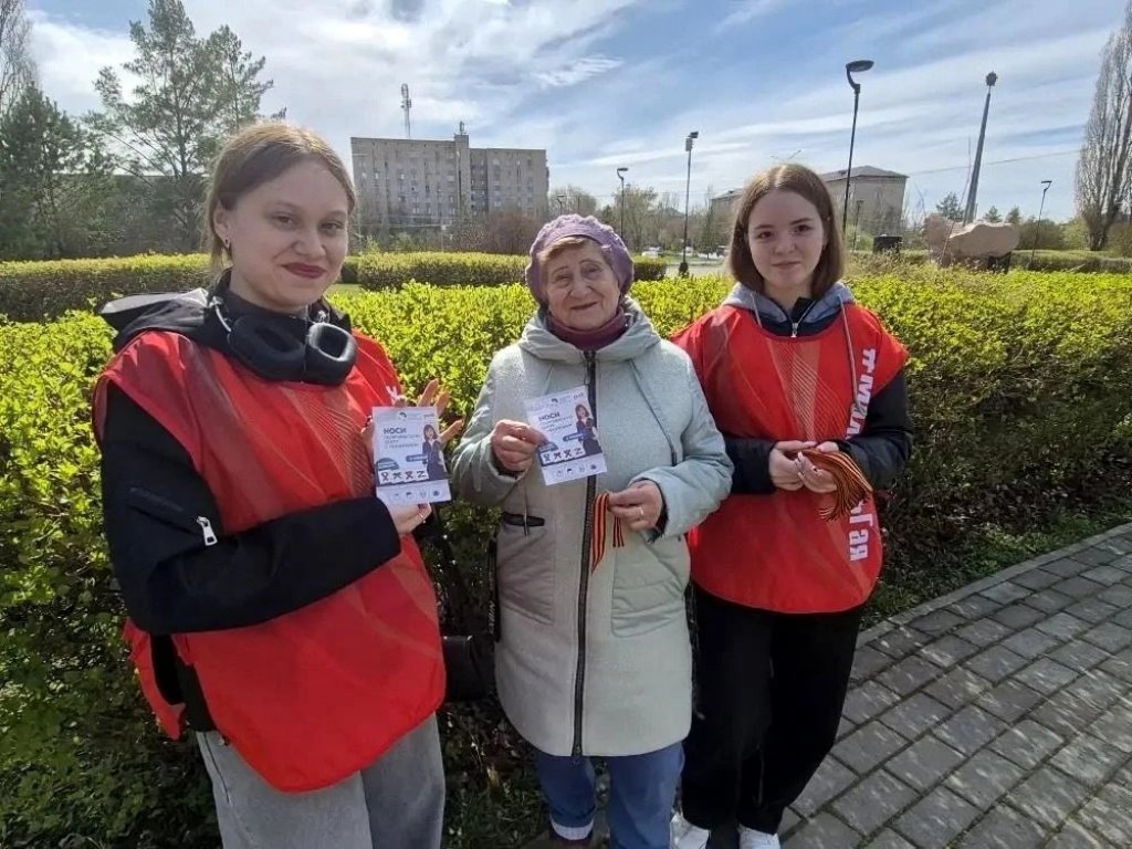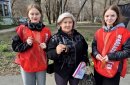 Волонтеры творческого объединения «Смайл» раздают прохожим Георгиевскую ленту, как символ уважения к исторической памяти победителей в Великой Отечественной войне, а также информационные листовки.