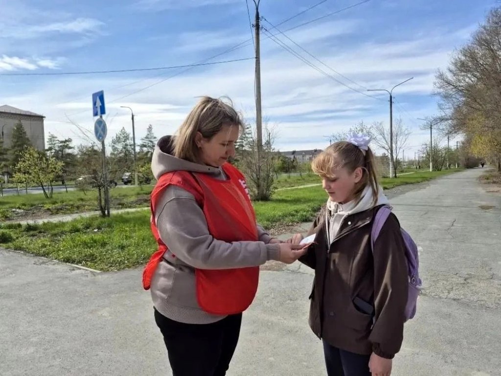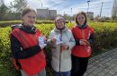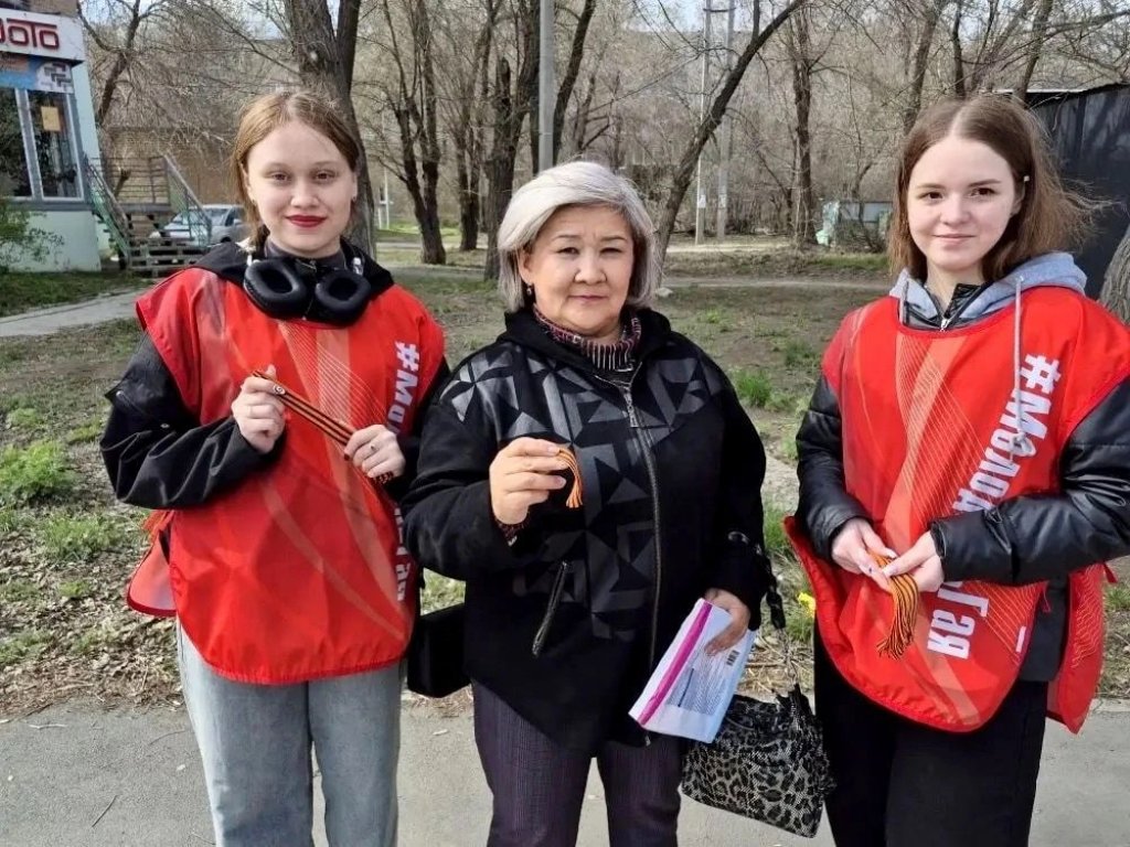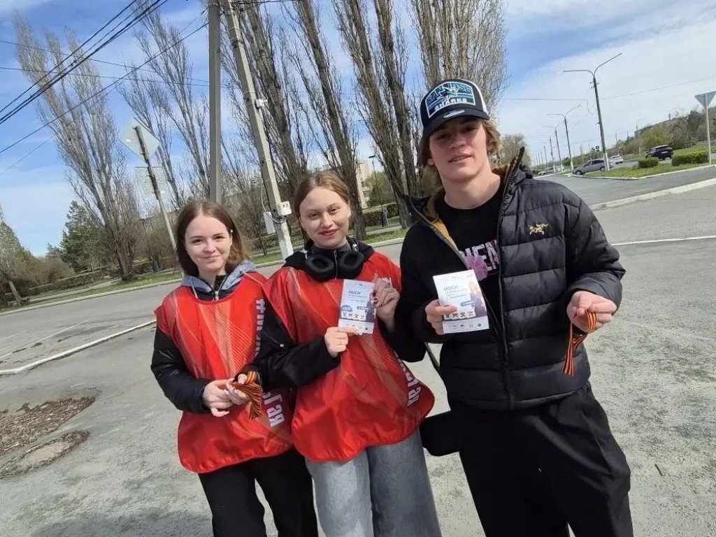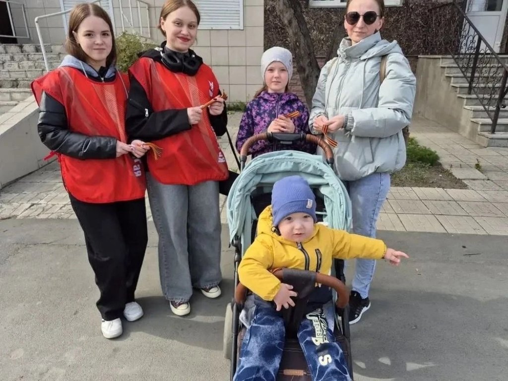 Волонтеры творческого объединения «Смайл» раздают прохожим Георгиевскую ленту, как символ уважения к исторической памяти победителей в Великой Отечественной войне, а также информационные листовки.